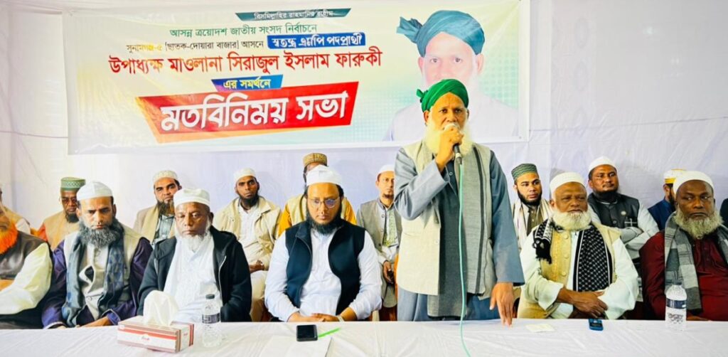 আসন্ন ত্রয়োদশ জাতীয় সংসদ নির্বাচনে সুনামগঞ্জ-৫ (ছাতক–দোয়ারাবাজার) আসনের স্বতন্ত্র সংসদ সদস্য পদপ্রার্থী উপাধ্যক্ষ মাওলানা সিরাজুল ইসলাম ফারুকীর সমর্থনে একটি মতবিনিময় সভা অনুষ্ঠিত হয়েছে। সভায় বক্তব্য রাখেন মাসিক পরওয়ানার সম্পাদক মাওলানা রেদওয়ান আহমদ চৌধুরী ফুলতলী এবং স্বতন্ত্র প্রার্থী মাওলানা সিরাজুল ইসলাম ফারুকী। বাংলাদেশ আনজুমানে আল ইসলাহ ও বাংলাদেশ আনজুমানে তালামীযে ইসলামিয়ার সমর্থনে ঘোষিত প্রাথমিক তালিকায় সুনামগঞ্জ-৫ […]