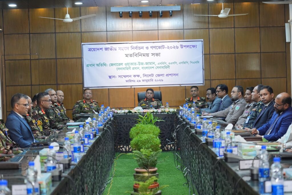 সেনাবাহিনী প্রধান জেনারেল ওয়াকার-উজ-জামান, এসবিপি, ওএসপি, এসজিপি, পিএসসি আসন্ন ত্রয়োদশ জাতীয় সংসদ নির্বাচন ও গণভোট-২০২৬ উপলক্ষ্যে সিলেট এরিয়া পরিদর্শন করেছেন আজ। সফরকালে বৃহষ্পতিবার বিকেলে সেনাবাহিনী প্রধান সিলেট জেলা প্রশাসনের সম্মেলন কক্ষে উর্ধ্বতন পর্যায়ের সামরিক কর্মকর্তা, সিলেট বিভাগের সকল জেলার বিভিন্ন আইন-শৃঙ্খলা রক্ষাকারী বাহিনী ও অসামরিক প্রশাসনের কর্মকর্তাদের সাথে মতবিনিময় করেন। মতবিনিময়কালে, আসন্ন জাতীয় সংসদ নির্বাচনকে […]