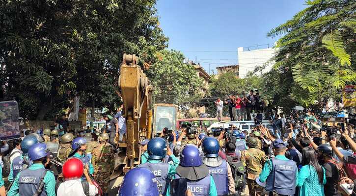 পুলিশি বাধায় মিছিলটি থেমে যায়। শিক্ষার্থীরা রাস্তায় বুলডোজার দুটি রেখে স্লোগান দিতে শুরু করেন। পরে তারা ব্যারিকেড ভাঙার চেষ্টা করলে কয়েকজন ভেতরে ঢুকলেও বেশিরভাগ শিক্ষার্থী বাইরে থেকেই আটকা পড়ে।
