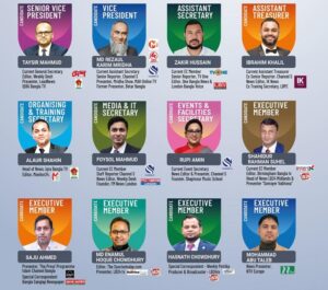সহকারী সম্পাদক পদে রয়েছেন বর্তমান নির্বাহী সদস্য জাকির হুসাইন, যিনি TV One-এর সিনিয়র রিপোর্টার এবং One Bangla News-এর সম্পাদক।